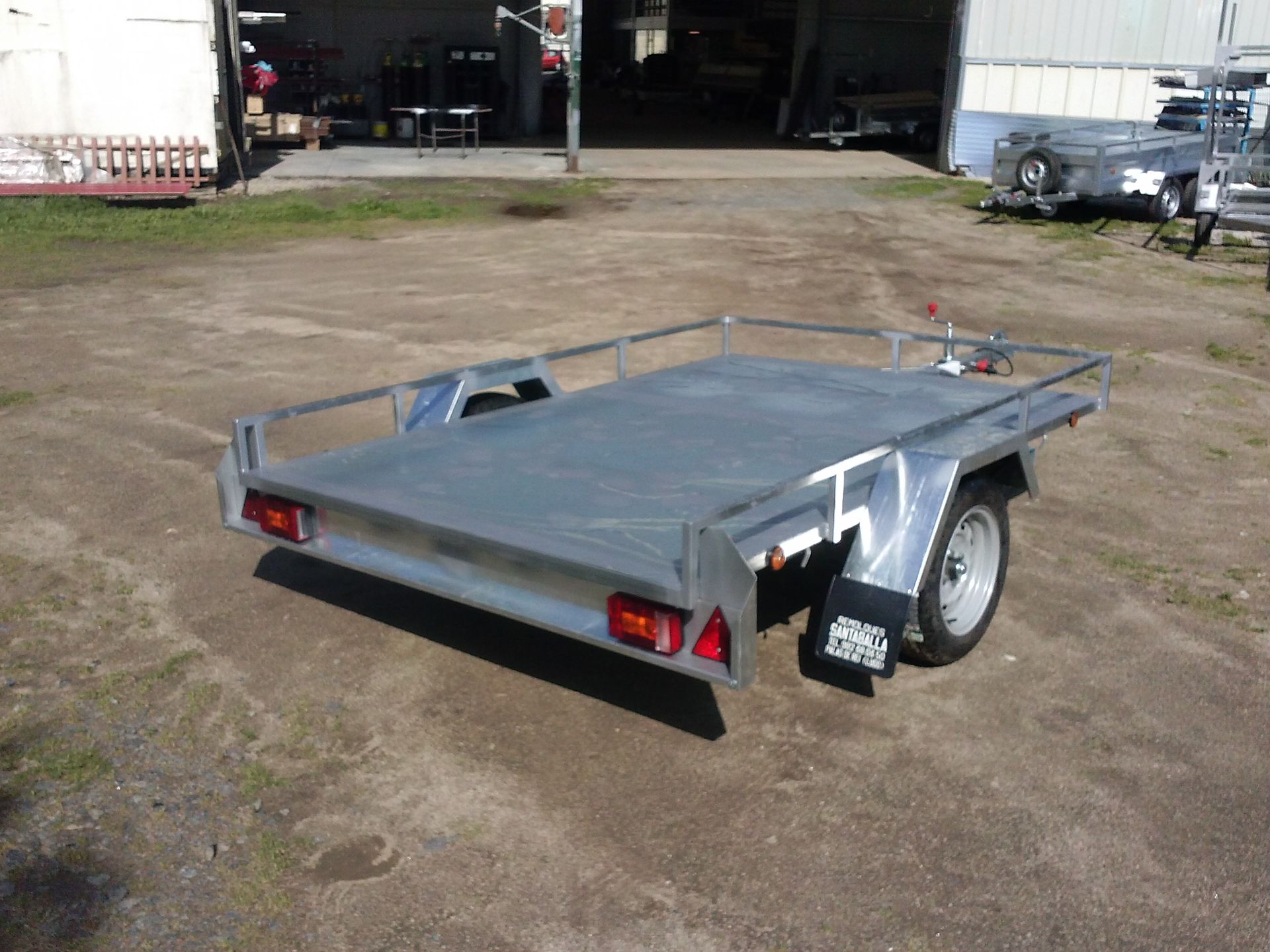 REMOLQUE EN PLATAFORMA DE 2.30X1.40M DE CAJA EN UN EJE SIN FRENO CON BARANDILLA LATERAL Y FRONTAL, RUEDA DE REPUESTO Y RUEDA JOCKEY, EJE DE 750KG CON RODAMIENTOS COMPACTOS. POSIBILIDAD DE PONER SOPORTES PARA MOTOS O RAMPAS PARA QUADS.