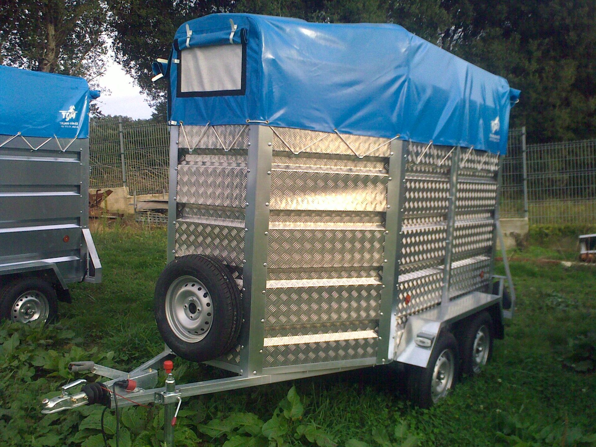 REMOLQUE DE 3X1.60M DE CAJA EN TANDEN GANADERO AFILADO CON PUERTA LATERAL, ARCOS Y TOLDO, LATERALES Y PISO EN ALUMINIO, PUERTA TRASERA EN DOS HOJAS Y RAMPA DE SACAR POR DEBAJO, RUEDA JOCKEY R60, EJES DE 1000KG CADA UNO Y ENGANCHE DE INERCIA DE 2000KG.